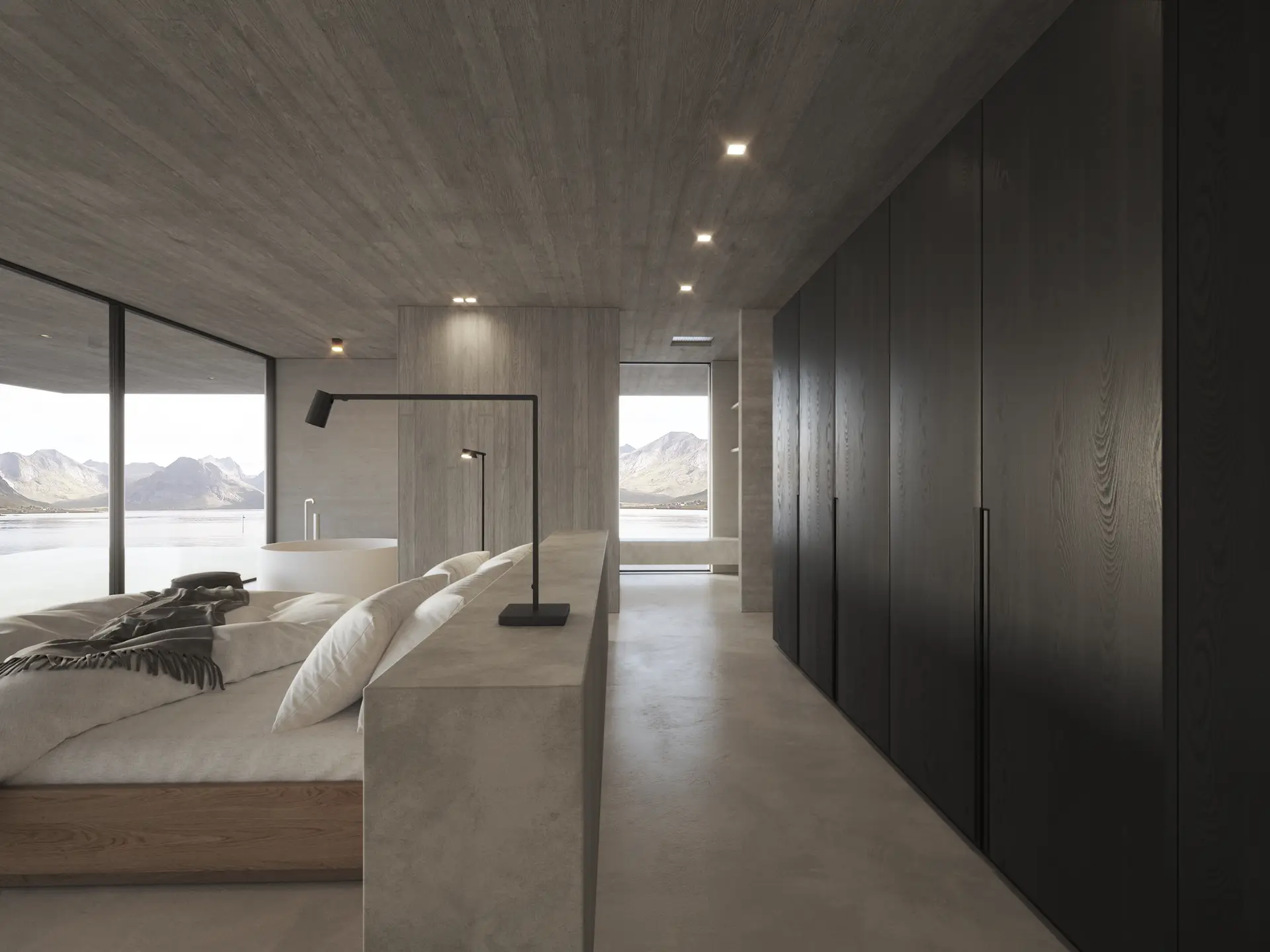 Perched on the rugged Norwegian shoreline, this domestic refuge offers a seamless connection between land and sea, conveniently set next to the main road, nestled against the mountain towering in the background. The architecture design embraces the breathtaking view, reflected off of the full height windows. The structure is defined by contrasting materials, marking the transition between floors: stone and concrete root the building into the earth, while wood and glass reach to the sky. On both levels, the triple glazed windows frame the overwhelming beauty of nature and a double mirrored deck surrounds the house, seeming to float over the sea, almost becoming part of the water, with a pier stretching out on the lower ground, for fishing or boating. Furnishings are kept minimal, and whenever possible, integrated into the architecture, to enhance the interior space and highlight the use of raw materials, all aimed at creating a balanced blend of rustic charm and modern elegance. This contemporary cabin blends the essence and aspects of loft living with the tranquility of a mountain retreat.
